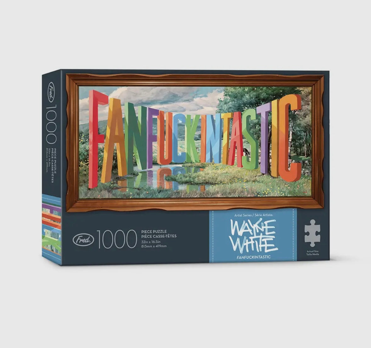 Set the mood with this 1000 piece puzzle featuring art by the incomparable Wayne White.  Image on puzzle is a representation of "FANFUCKINTASTIC," a work of art created by the artist in 2020. High quality puzzle includes 1000, 2mm thick ribbon cut pieces made from 90% recycled materials and an anti glare finish.  Makes an awesome gift!
