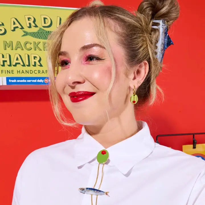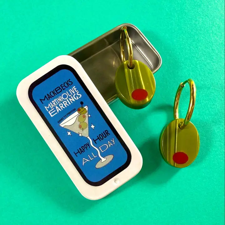 The Olive Earrings are a savory nod to cocktail hour, styled like the perfect martini garnish. Each earring is made from glossy, marbled cellulose acetate and hung from 20 mm gold-plated hinged hoops — lightweight, comfortable, and made to wear on repeat.