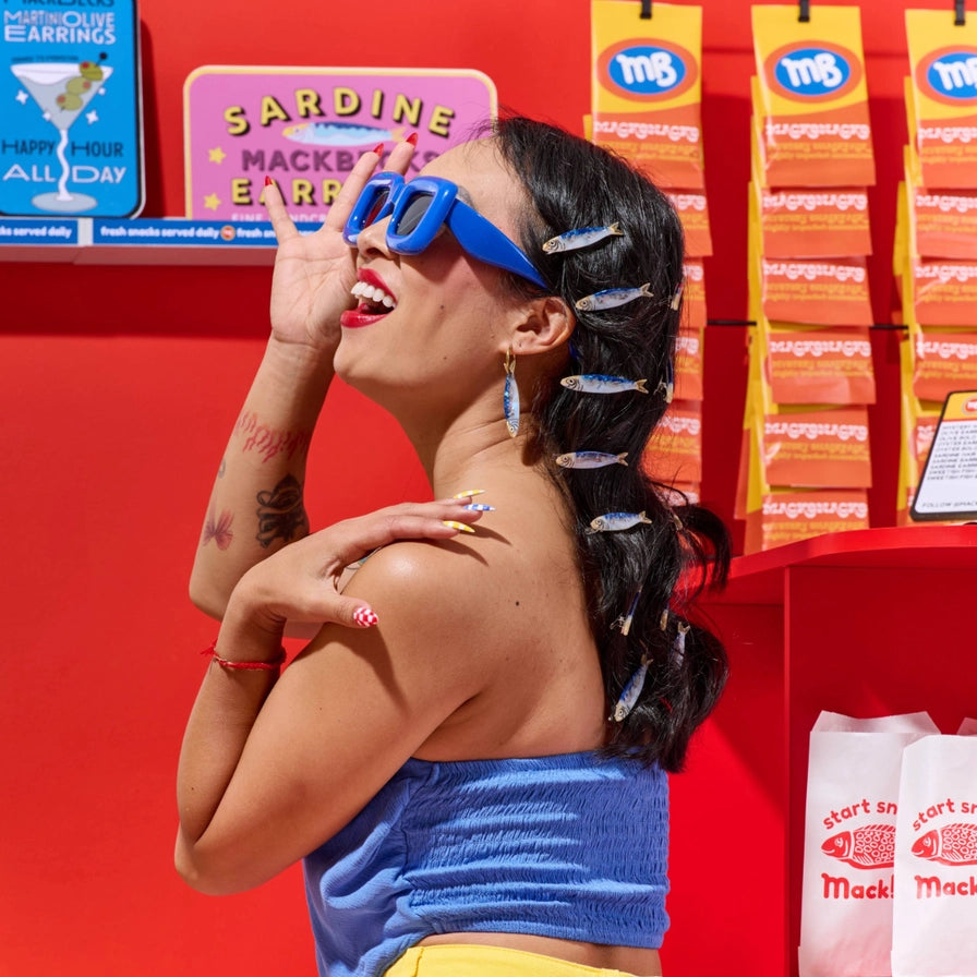 A signature Mack Becks design and the original inspiration behind the Sardine Hair Claw and Barrette Set, the Sardine Earrings remain the definitive snack-for-your-ears.