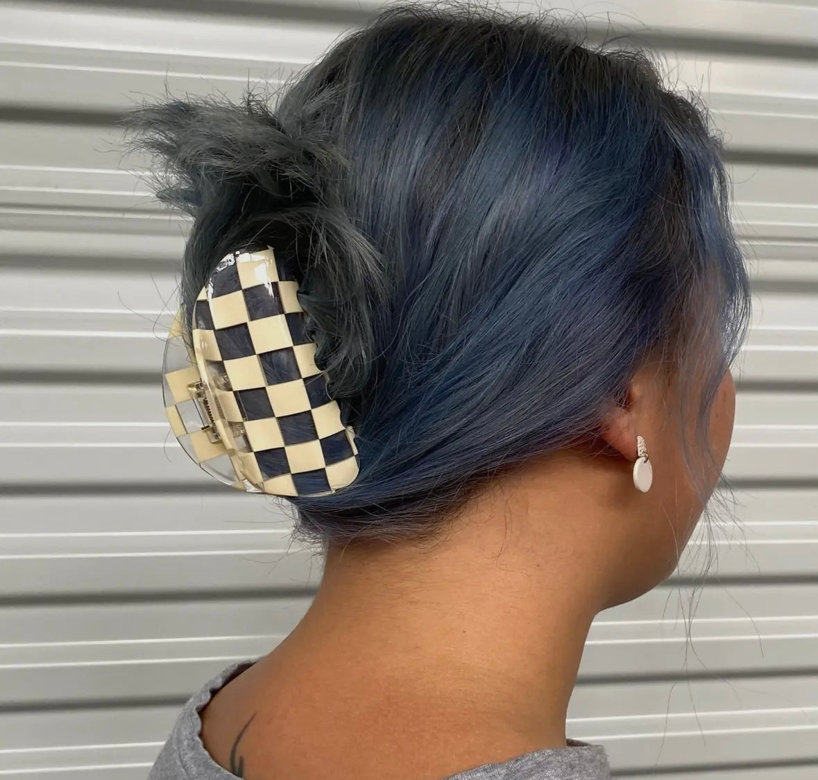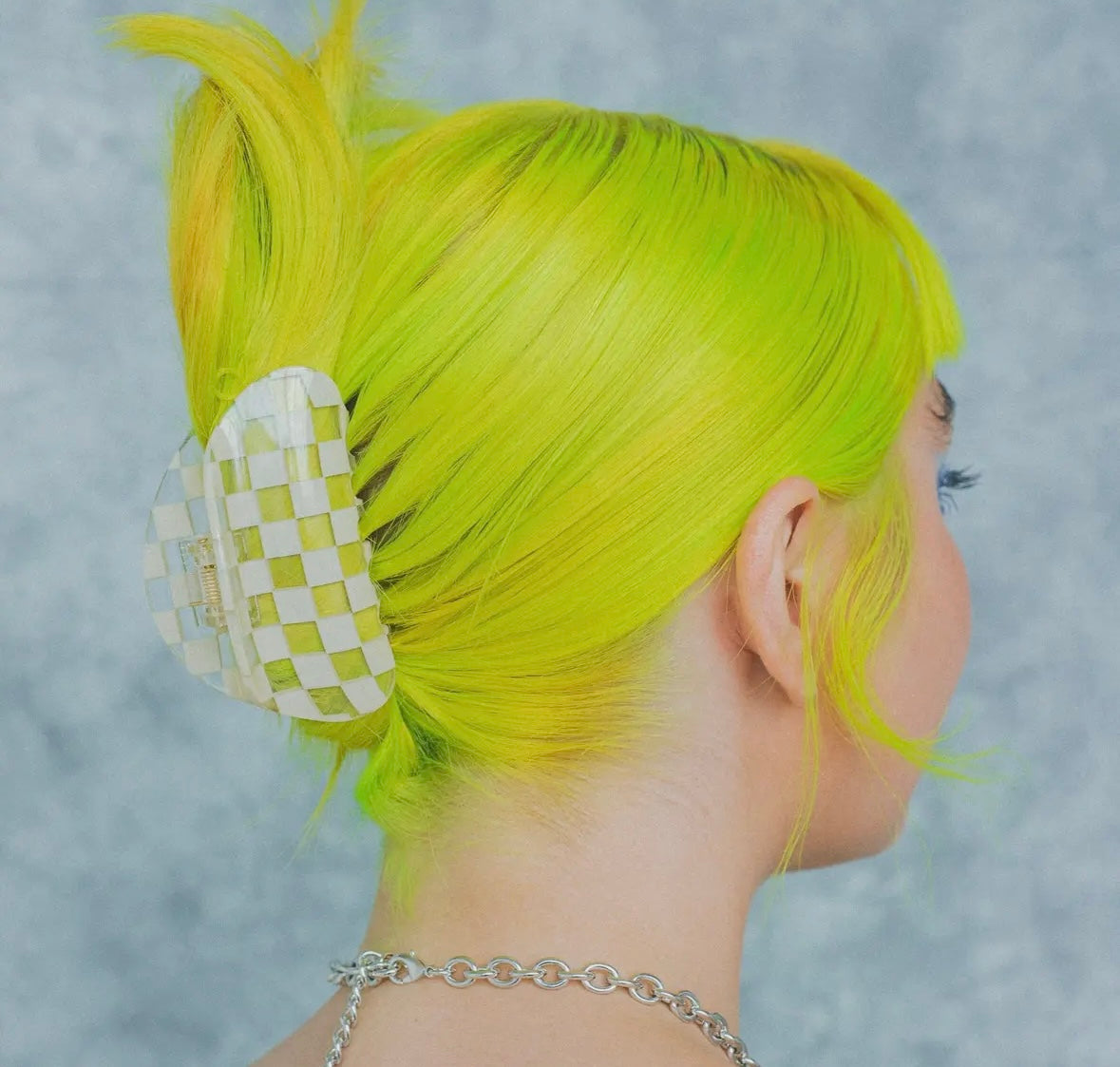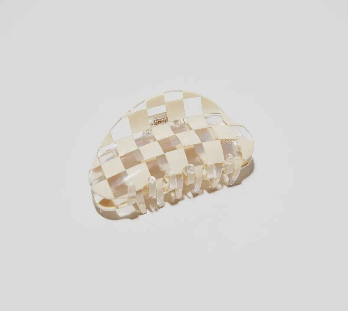 Super versatile, medium sized hair claw by CHUNKS. Featuring high quality clear acetate, plant based bio-plastic with ivory checkerboard pattern. Silver toned metal is lead and nickel free.