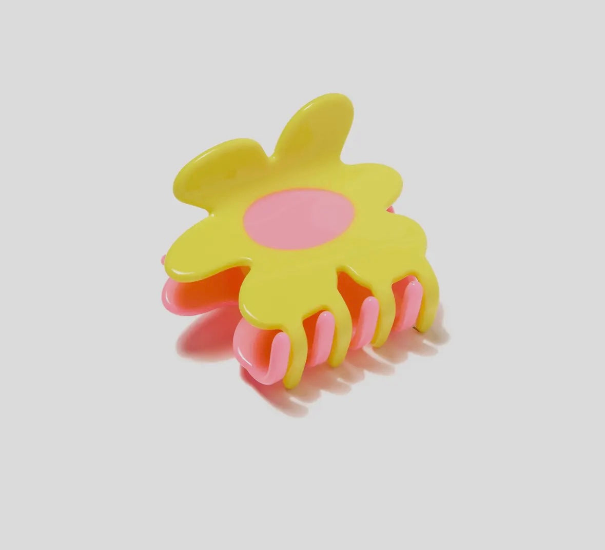 Playful small/medium sized flower hair claw by CHUNKS. Featuring high quality pink and yellow acetate, plant based bio-plastic. Silver toned metal is lead and nickel free. Slight variations due to the handmade nature of this product.