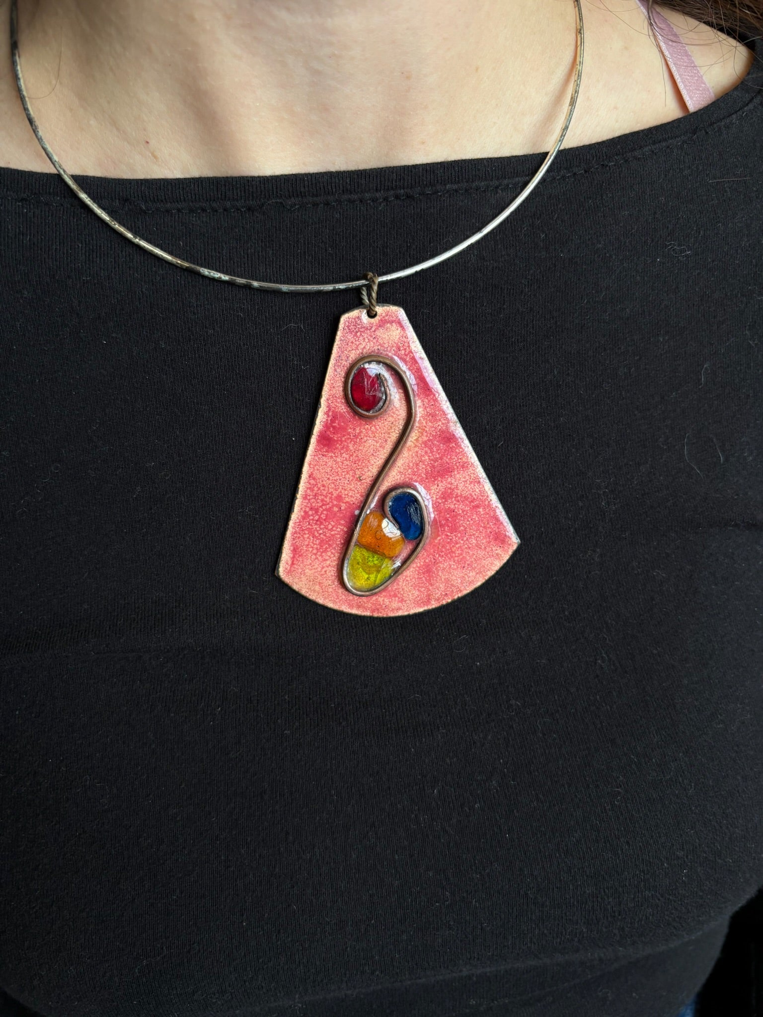 A striking example of mid-century artisan jewelry, this handcrafted pendant features vitreous enamel on copper, showcasing the timeless craftsmanship and vibrant color typical of the era. The pendant is elegantly suspended from a silver-plated neck wire, creating a clean, modern silhouette that highlights the enamel’s glossy surface and intricate design.