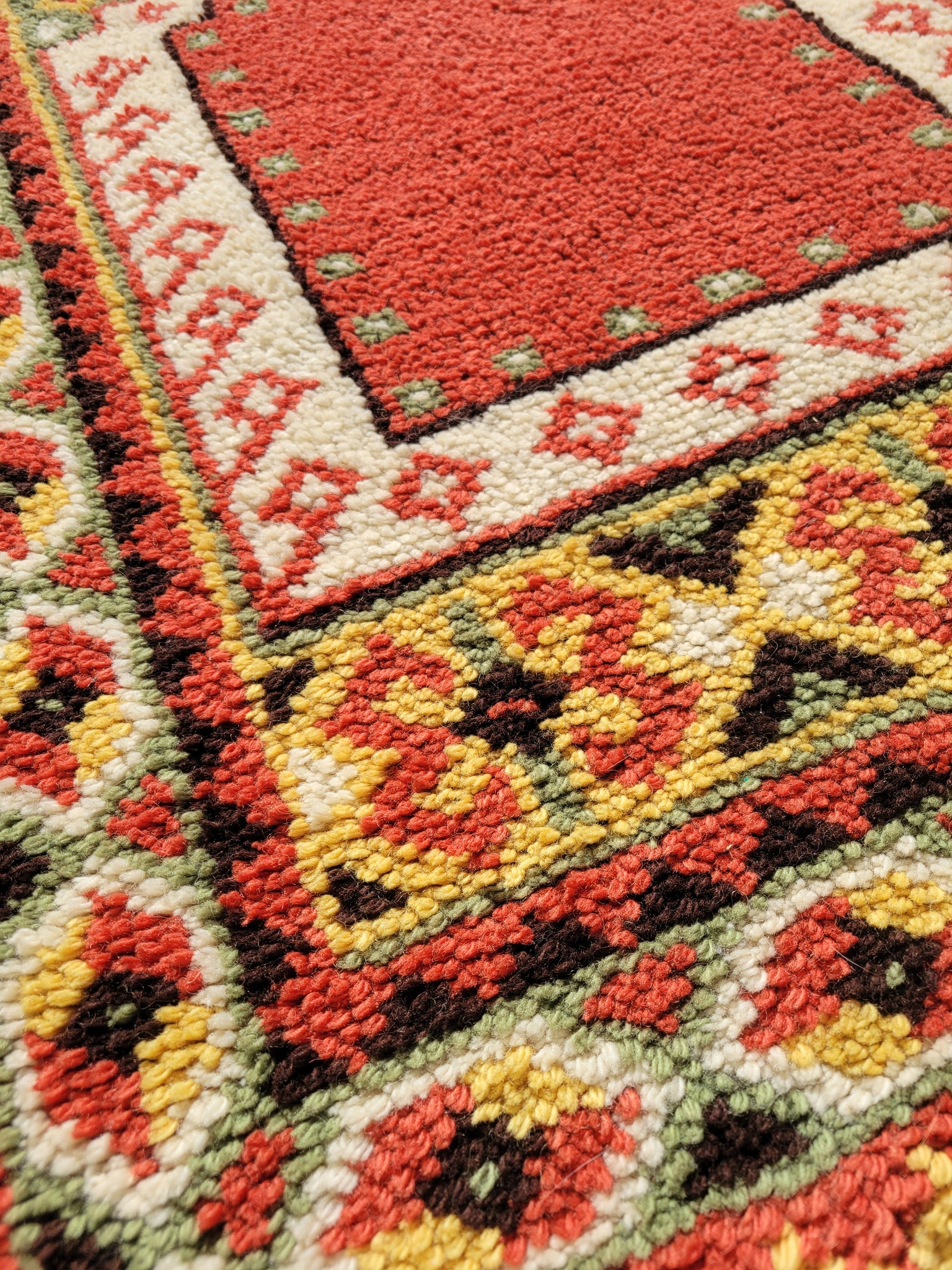 Rich in color and tradition, this handwoven wool rug features a classic prayer niche design framed by geometric borders. Warm tones of brick red, gold, and sage green are balanced by ivory accents, creating a striking yet cozy composition. Perfect as a wall hanging, tabletop accent, or small floor rug, it brings the warmth and texture of traditional craftsmanship to any space.